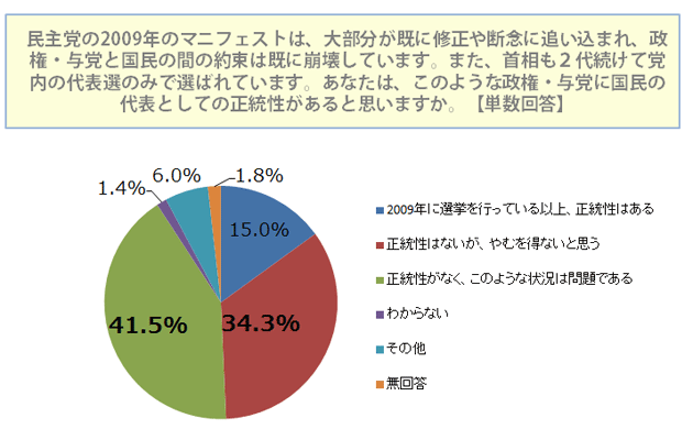 民主党マニフェストが崩壊し、首相が二代続けて党内の代表選で選ばれているという現状において、政権・与党に国民の代表としての正統性があるかどうかを聞く設問では、41.5%が「正統性はなく、このような状況は問題である」と回答し、「2009年に選挙を行っている以上、正統性はある」との回答(15.0%)を大きく上回りました。一方で、「正統性はないが、やむを得ないと思う」との回答も34.3%になっています。