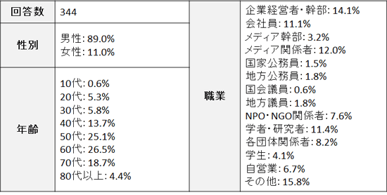 今回の調査結果は、言論NPOの活動にこれまで参加していただいた全国の有識者約6000人を対象に、2016年5月7日から5月20日の期間でアンケートの回答を依頼し、回答のあった344人の回答内容を分析しました。