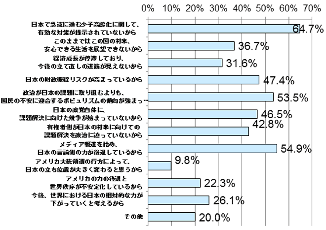 この他、悲観している理由として「メディア報道を始め、日本の言論側の力が後退しているから」(54.9%)、「政治が日本の課題に取り組むよりも、国民の不安に迎合するポピュリズムの傾向が強まっているから」(53.5%)の2つの選択肢が5割を超える結果となりました。