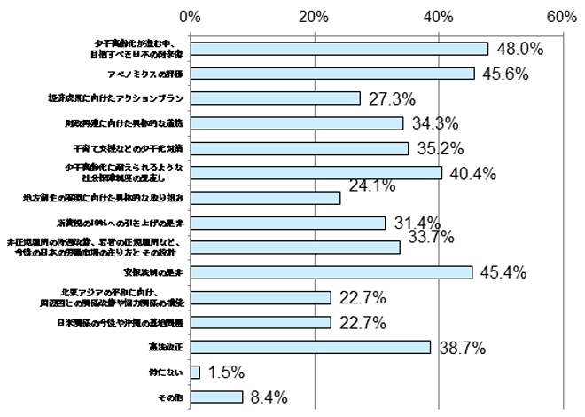 一方で、「少子高齢化に耐えられるような社会保障制度の見直し」(40.4%)も4割を超えており、多くの有識者は少子高齢化、それに伴う社会保障制度の見直しが今回の大きな争点の1つだと考えていることが分かります。