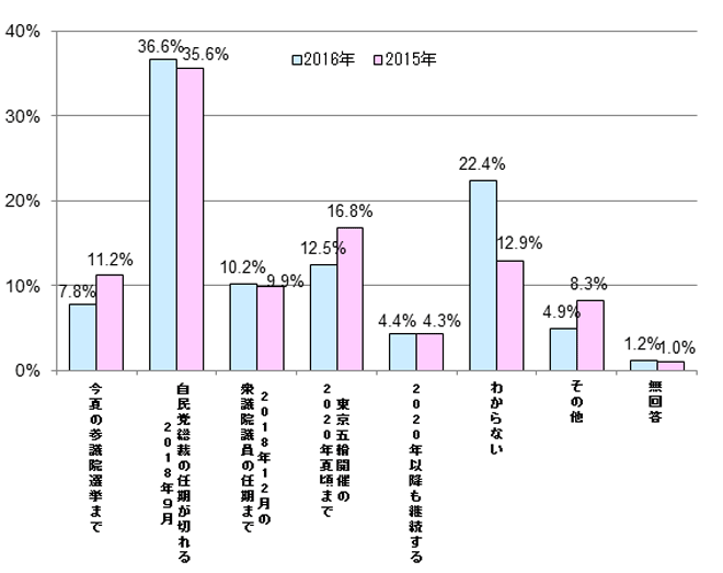 一方で、「東京五輪開催の2020年夏ごろ」までとの回答も12.5%(昨年16.8%)と一定程度存在しており、更なる長期政権を望む声も存在しています。