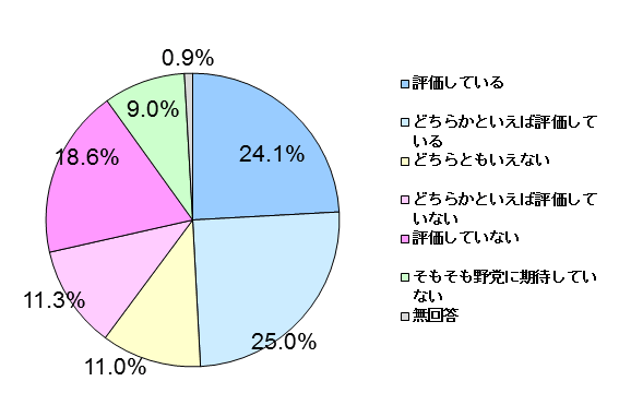 2016年7月の参議院選挙に向けて、野党が共闘して候補者の一本化を行うなどの取り組みを行い始めています。こうした野党の取り組みを評価しているかを尋ねたところ、「評価している」(24.1%)、「どちらかといえば評価している」(25.0%)との回答を合わせると、49.1%と5割近くの人が評価しており、「評価していない」(18.6%)、「どちらかといえば評価していない」(11.3%)の29.9%を上回りました。