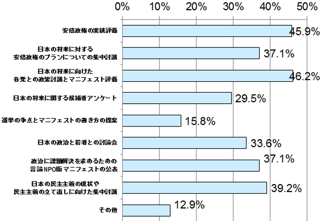 一方、「日本の民主主義の現状や民主主義の立て直しに向けた集中討議」(39.2%)と、そもそも民主主義という制度についての議論を行うべきとの回答も4割に迫りました。