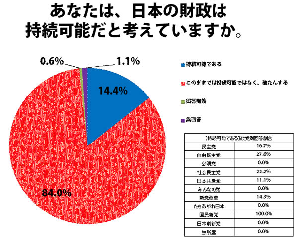 日本の財政は持続可能か、という認識では「このままでは持続可能ではなく、日本の財政は破たんする」と答えた候補者は全体では152人(84%)と8割を超えており、うち公明党、「みんなの党」、「たちあがれ日本」、「日本創新党」は回答者全員、「新党改革」は回答者の85.7%、民主党は80.6%、自民党は72.4%の回答者がそうした危機感を持っています。逆に日本の財政は持続可能と判断している候補者は、民主党が6人(16.7%)、自民党は8人(27.6%)で、国民新党は回答者の2人全員が持続可能と回答しています。