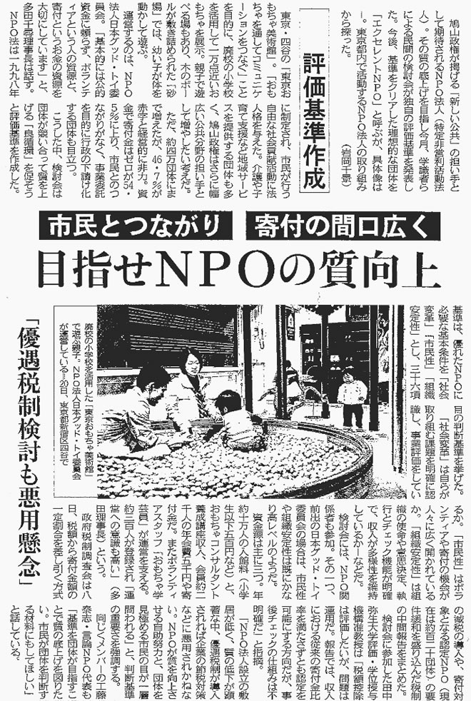 鳩山政権が掲げる「新しい公共」の担い手として期待されるNPO法人(特定非営利活動法人)。その質の底上げを目指し今月、学識者らによる民間の検討会が独自の評価基準を発表した。