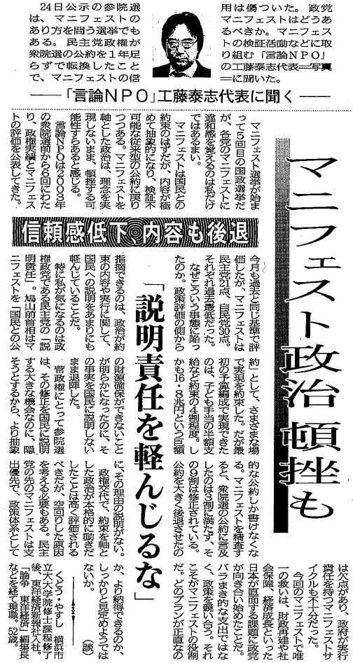 【西日本新聞】マニフェスト政治 頓挫も ―「説明責任を軽んじるな」