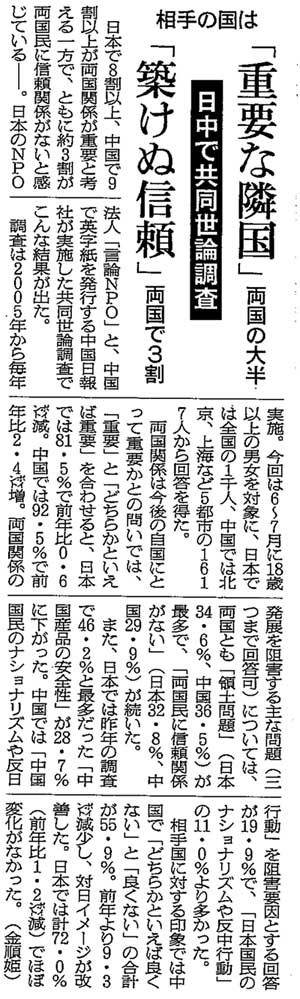 2010/08/15 朝日新聞 asahi.com 重要な隣国だけど「信頼関係なし」3割 日中世論調査