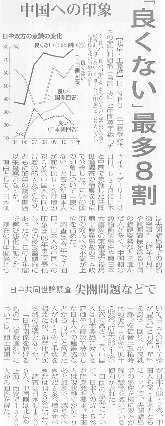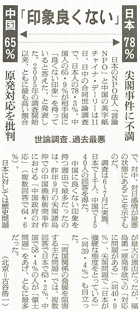 「<世論調査>日中ともに好感度が低下、尖閣諸島問題や福島原発事故が影響」