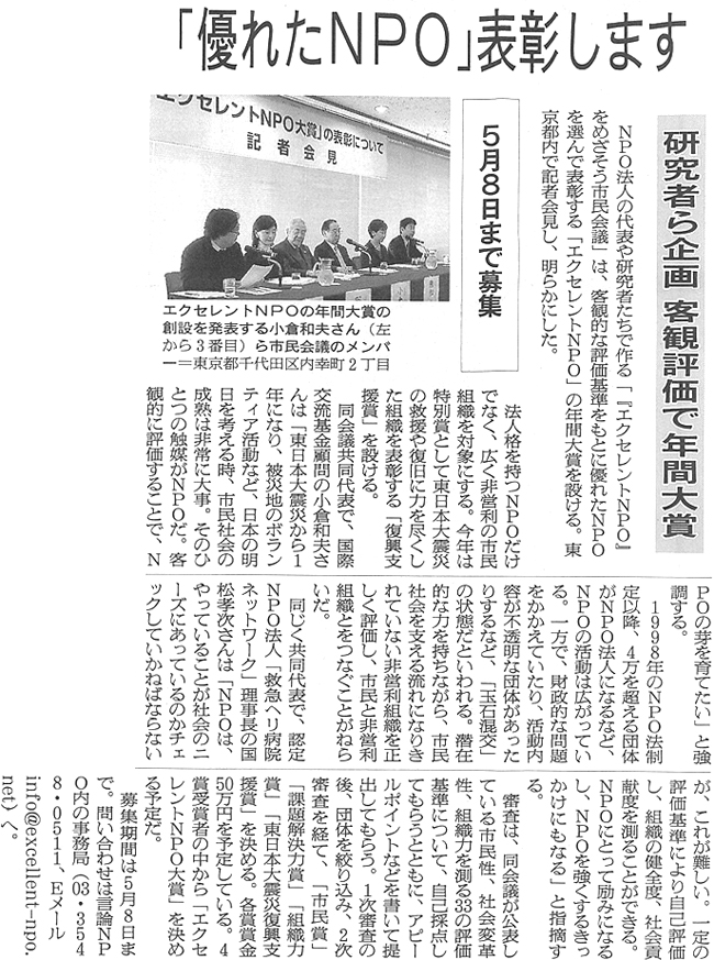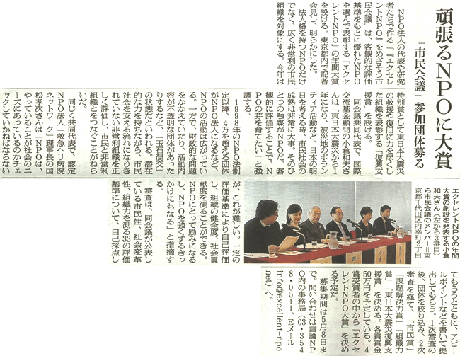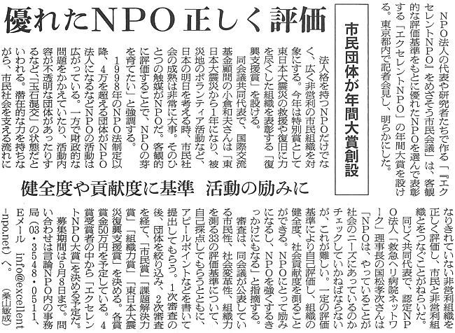 NPO法人の代表や研究者たちで作る「『エクセレントNPO』をめざそう市民会議」は、客観的な評価基準をもとに優れたNPOを選んで表彰する「エクセレントNPO」の年間大賞を設ける。都内で記者会見し、明らかにした。
