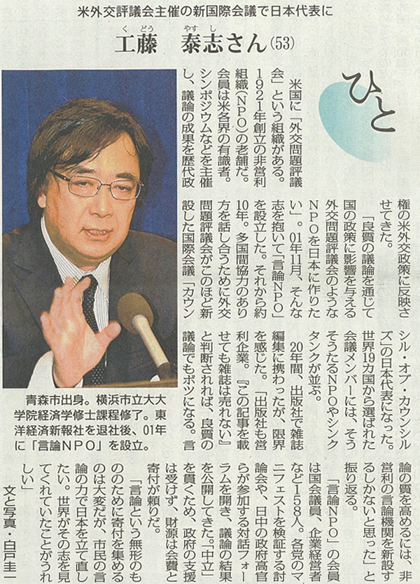 米国に「外交問題評議会」という組織がある。1921年創立の非営利組織(NPO)の老舗だ。会員は米各界の有識者。シンポジウムなどを主催し、議論の成果を歴代政権の米外交政策に反映させてきた。