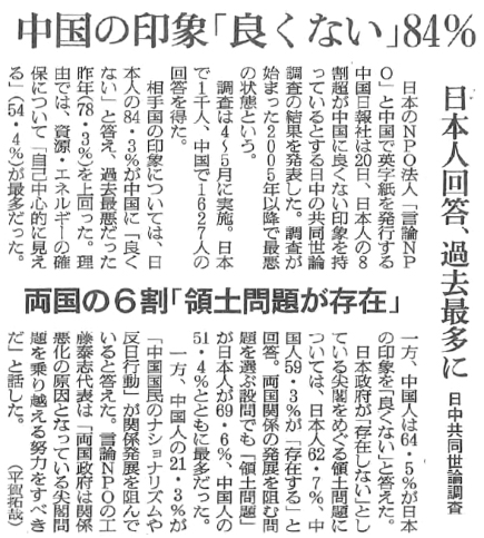 日本のNPO法人「言論NPO」と中国で英字紙を発行する中国日報社は20日、日本人の8割強が中国に良くない印象を持っているとする日中の共同世論調査の結果を発表した。調査が始まった2005年以降で最悪の状態という。
