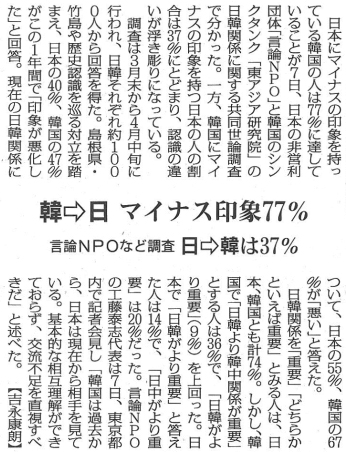 【毎日新聞】韓⇒日 マイナス印象77% 日⇒韓は37%