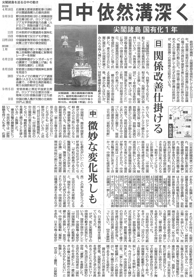 【毎日新聞】尖閣諸島 国有化1年 日中依然溝深く