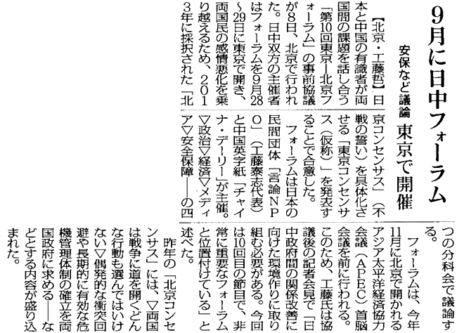 【読売新聞】【毎日新聞】9月に日中フォーラム 安保など議論 東京で開催