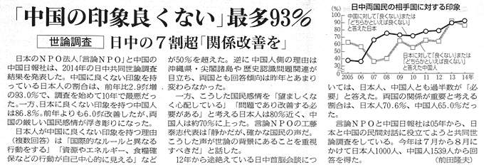 【西日本新聞】『中国の印象良くない』最多93% 日中の7割超『関係改善を』
