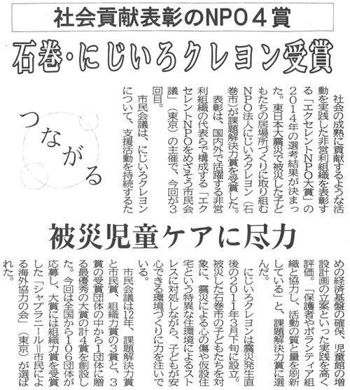 社会貢献表彰のNPO4賞 石巻・にじいろクレヨン受賞 被災児童ケアに尽力