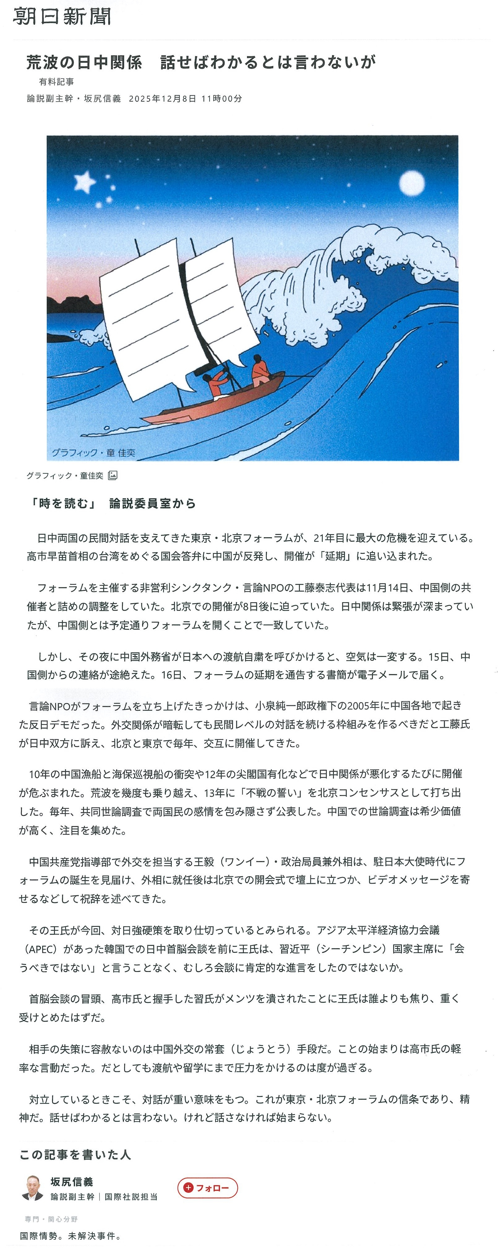【朝日新聞デジタル】荒波の日中関係 話せばわかるとは言わないが