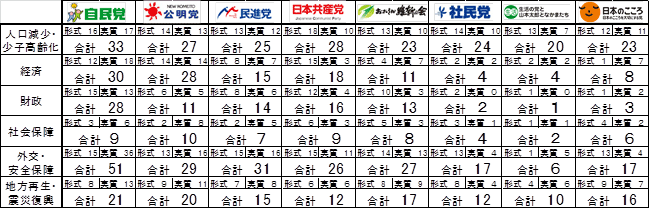 公明党 29点 :「人的交流」だけでは与党の政策として小ぶり。外交安保の全体に占める優先度も不透明