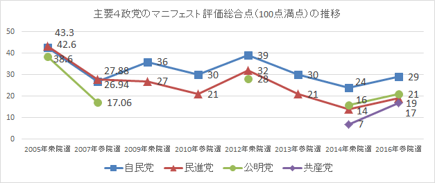 その結果、8党の公約の評価は、最も高い自民党でも100点満点で29点にとどまり、2014年衆院選時の評価と比べて若干の改善傾向がみられたものの、依然、国民との約束としての公約が、日本の将来や課題に対する解決プランとしてつくられていないということが明らかになり、極めて厳しい評価となりました。
