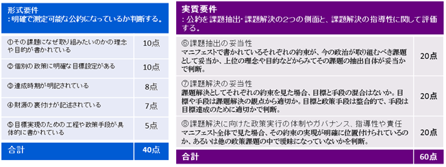 言論NPOは、約束の評価可能性を重視した形式要件と、内容自体を評価する実質要件の2つの基準でマニフェストの評価を行っています。